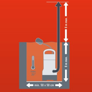 Pompa pentru apa murdara puternica si rezistenta pentru golirea baltilor din gradini, subsolurilor si santierelor de constructii inundate. Absoarbe impuritati cu dimensiuni de pâna la Ø 35 mm. Pompa este prevazuta cu un întrerupator cu flotor pentru pornire/oprire automata pentru diverse niveluri de apa. Întreaga carcasa este facuta din material rezistent la impact (plastic). Standardul de înalta calitate al materialelor si al designului constructiei, de ex., arbore motor din otel inoxidabil de calitate superioara, garanteaza exploatarea fara întretinere si folosirea de lunga durata.
